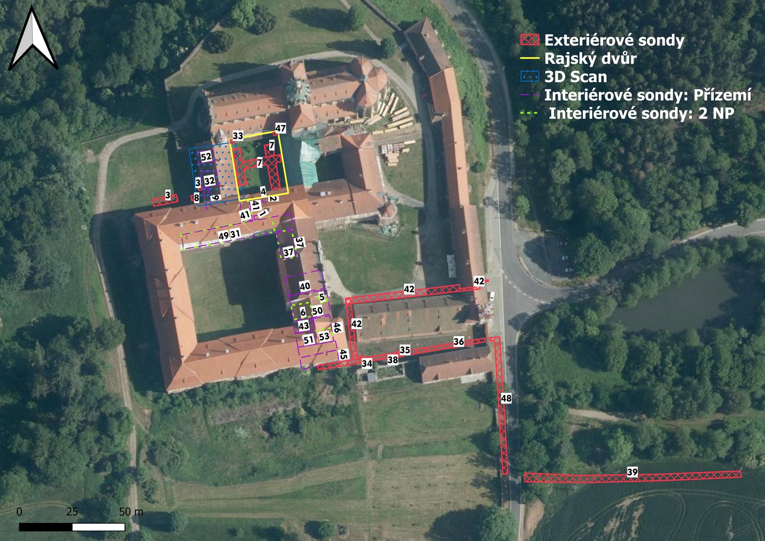 V rámci zemních prací vně budov (na vstupním nádvoří, v prostoru hospodářského dvora, bývalých pivovarských sklepů a v okolí jižní zahrady vně klášterního areálu) byly provedeny liniové výkopy pro inženýrské sítě. V přízemí nového konventu byly v severním křídle odtěženy navážky novějších podlah až na úroveň podlahy prvního pivovarského humna, která přibližně odpovídá úrovni barokní klášterní podlahy. V prvním patře nového konventu byla v ambitu odstraněna novodobá betonová dlažba, pod kterou se dochovaly části dlažby zámeckého pivovaru a také základy náduvníků (nádob k namáčení ječmene před sladováním). Odkryté podlahy v obou patrech nového konventu byly zdokumentovány a zachovány pod nově položenou kamennou dlažbou. V chodbě starého konventu (správněji infirmaria – více viz okruh Vrcholně barokní přestavba v tomto článku) byl dokumentován stav po odstranění příček z konce 19. a poloviny 20. století.