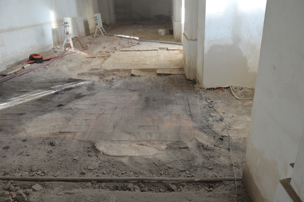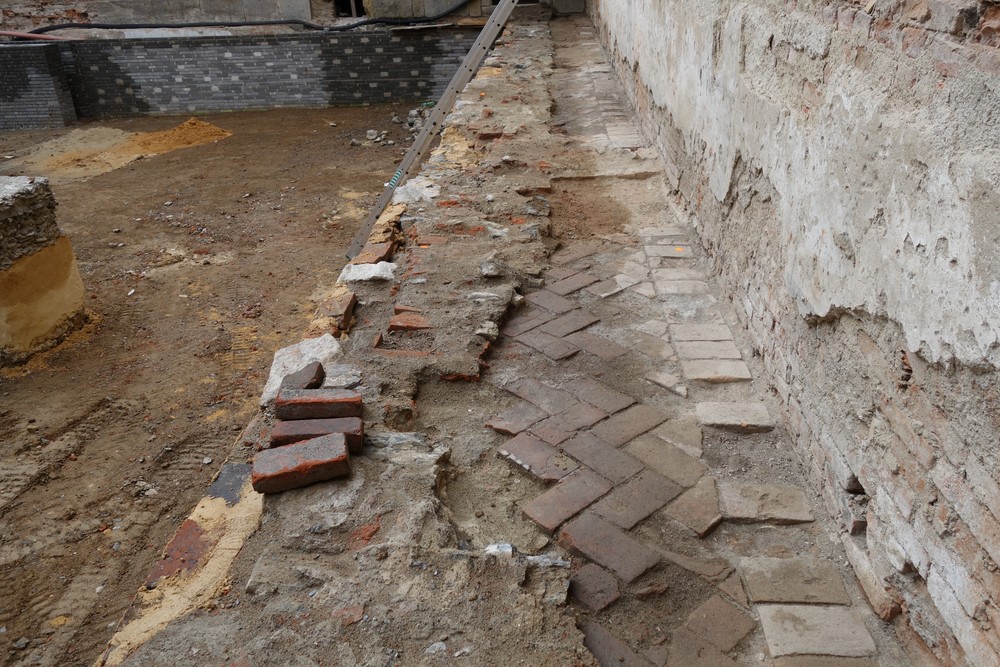 V rámci stavebních prací se obnovuje úroveň rajského dvora odpovídající povrchu terénu v době baroka, v 19. století byl prostor dvora snížen o 4 m pro vestavbu sladovnického humna. Z rajského dvora starého konventu byly odstraněny havarijní pozůstatky pivovarských konstrukcí. Jednalo se především o přizdívky k východní fasádě dvora a k jižní fasádě kostela. Zde byla přizdívka ubourána na úroveň, ve které bylo nalezeno barokní dláždění původní ambitové chodby s torzem schodiště a hrobem pod ním. Jedna ze sond odhalila také rub opravované kamenné klenuté štoly odvádějící odpadní vody z tzv. starého konventu. K rubu přiléhala dosud neznámá mohutná zděná konstrukce.