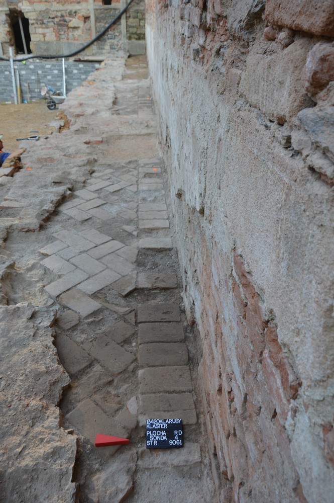 Ze středověkých vrstev osídlení kláštera bylo zachyceno pouze spáleniště. Již z předchozích výzkumů víme, že většina budov středověkého konventu zanikla při pozdějších, zejména barokních přestavbách. Spáleništní vrstvy červené a černé barvy se táhnou nad podložím v prostoru vstupního průjezdu do areálu i v nádvoří před severním průčelím budovy stájí. Dle zlomků keramiky je datujeme do 12. století včetně a souvisí tedy se zánikem nejstarších, pravděpodobně dřevěných, budov kláštera. Dnešní vstupní průjezd je výsledkem přestavby z 18. století, ale ve výkopu na vedení elektřiny se projevily stopy dřívějšího stavu se širšími základovými patkami vstupních portálů a kamennou dlažbou v hloubce asi 40 cm pod spodním okrajem žulového soklu na obvodových stěnách.