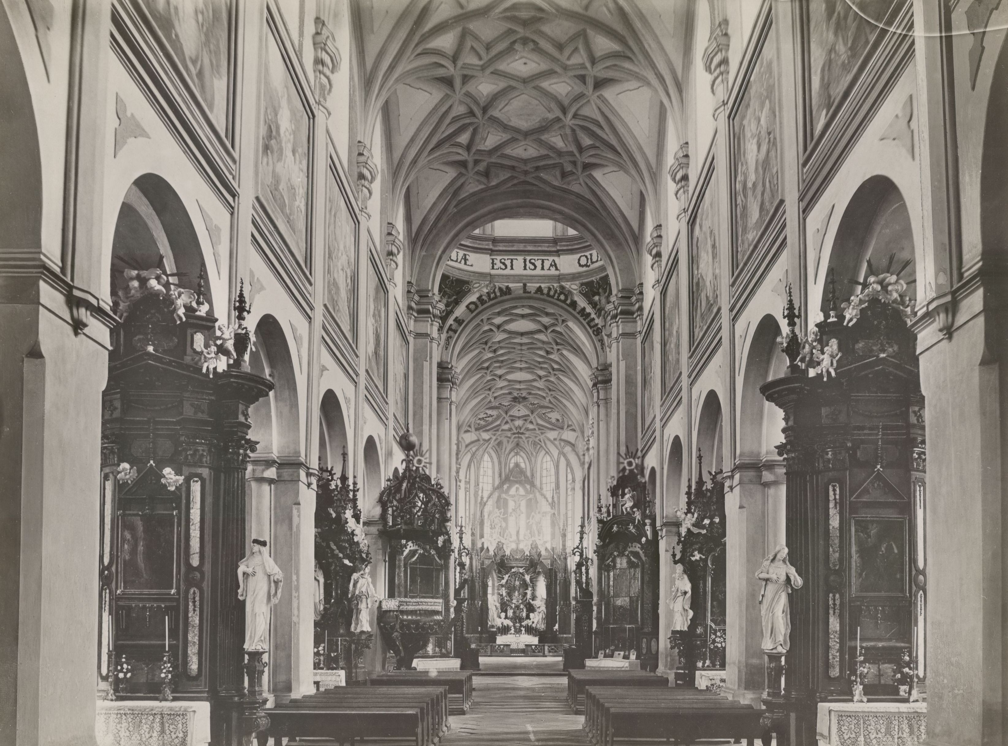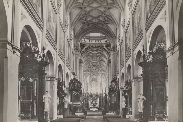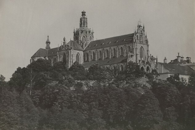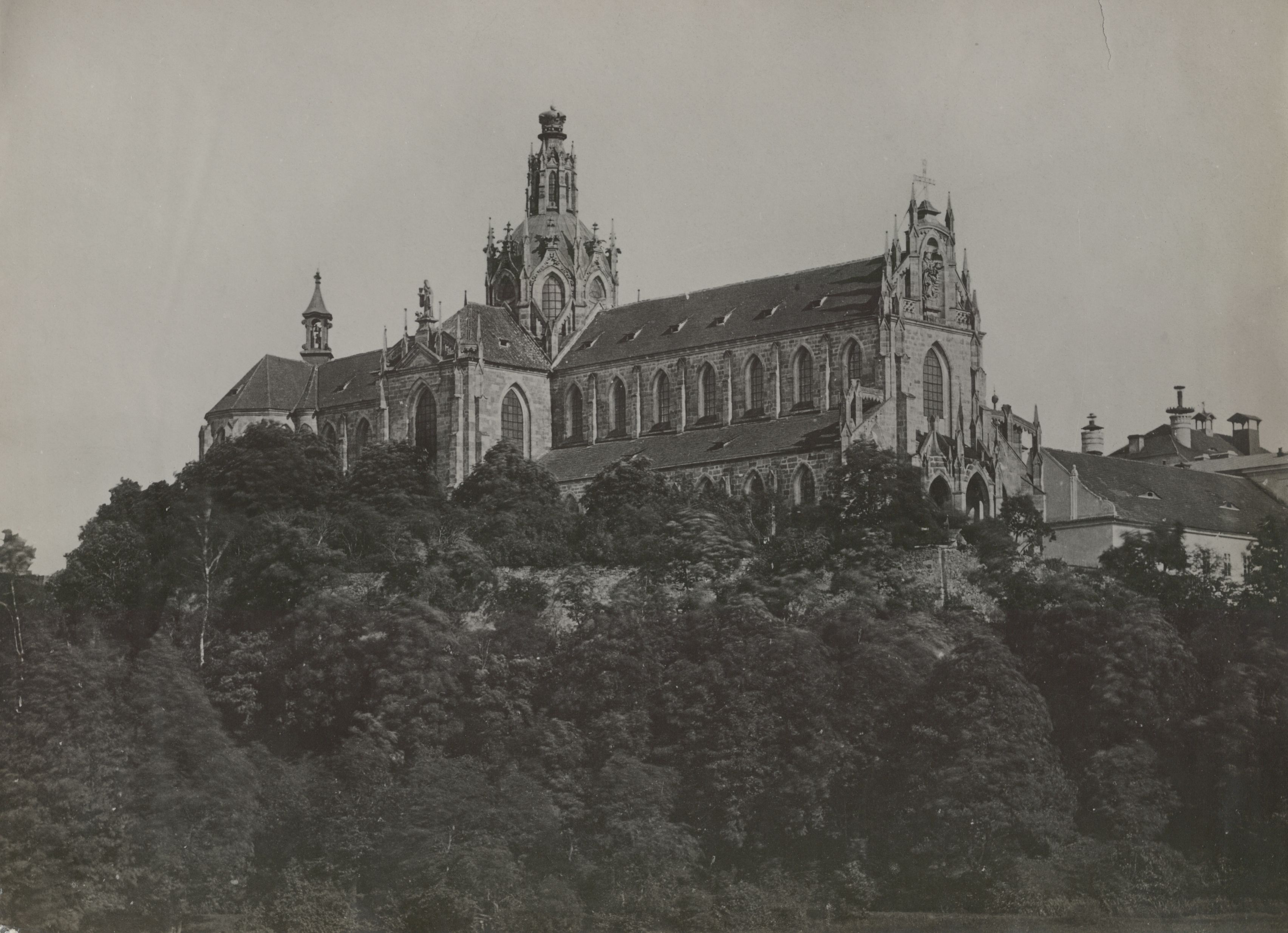The church was consecrated in 1233, and was apparently the largest church in Bohemia at the time. The elements that are preserved are: the wall of the southern side nave; the southern part of the transept; the lower section of the northern side walls; the core of the inter aisle pillars and a fragment of arched frieze, as well as a walled-in Romanesque window in the cock-loft of the cloister, in the corner between the transept and southern nave. In 1279 the cloister was pillaged; repairs followed only from 1306–18. In the 1370s it was newly fortified, a Gothic apse was developed in the choir of the church (or perhaps just before 1504?) and the exceptional All Saints chapel (apparently on the site of an earlier one that had been there in the 13th century).