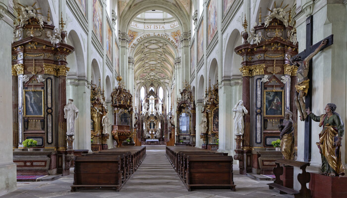 It represents the life of the monks in the baroque Benedictine monastery, their accommodation, meals, spiritual life, work and rest in the restored parts of the new and old convent, in the paradise garden and in the original interior of the baroque-gothic Church of the Assumption of the Virgin Mary by the architect Jan Blažej Santini Aichel.